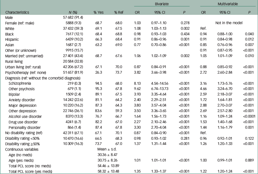 Individuals who were prescribed psychotropic medications had significantly higher PCL scores (mean=58.32, s.d.=13.48) compared with those who did not receive a prescription (mean=54.46, s.d.=13.89; t=35.51, P<0.001, Cohen's d=0.28). A single z-score unit increase on the standardised total PCL was associated with 26% greater likelihood of a pharmacological treatment (Table 1). In addition to PTSD symptom severity, receiving a prescription was associated with comorbid psychiatric diagnoses and with being rated with a functional disability of 50% or more. Veterans living in urban areas were less likely to receive a prescription for psychotropic medications than those who are living in rural areas, and ethnic minorities were also less likely to receive a prescription than White veterans. Adjusting for all other covariates, veterans who received psychotherapy where significantly more likely to prescribed psychotropic medication for PTSD (OR=2.72; Table 1).