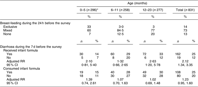 Table 1 Rates of breast-feeding and of diarrhoea according to receipt and consumption of donated infant formula, with corresponding RR and 95 % CI, by age