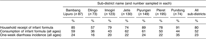 To enable a comparison of the key survey findings by geographical location, and thus rule out local influences, Table 2 provides the percentages of three key variables assessed in each of the seven surveyed sub-districts. There were no interactions between differences in household receipt or consumption of infant formula and risk of diarrhoea among any of the infants and young children across the seven sub-districts surveyed.