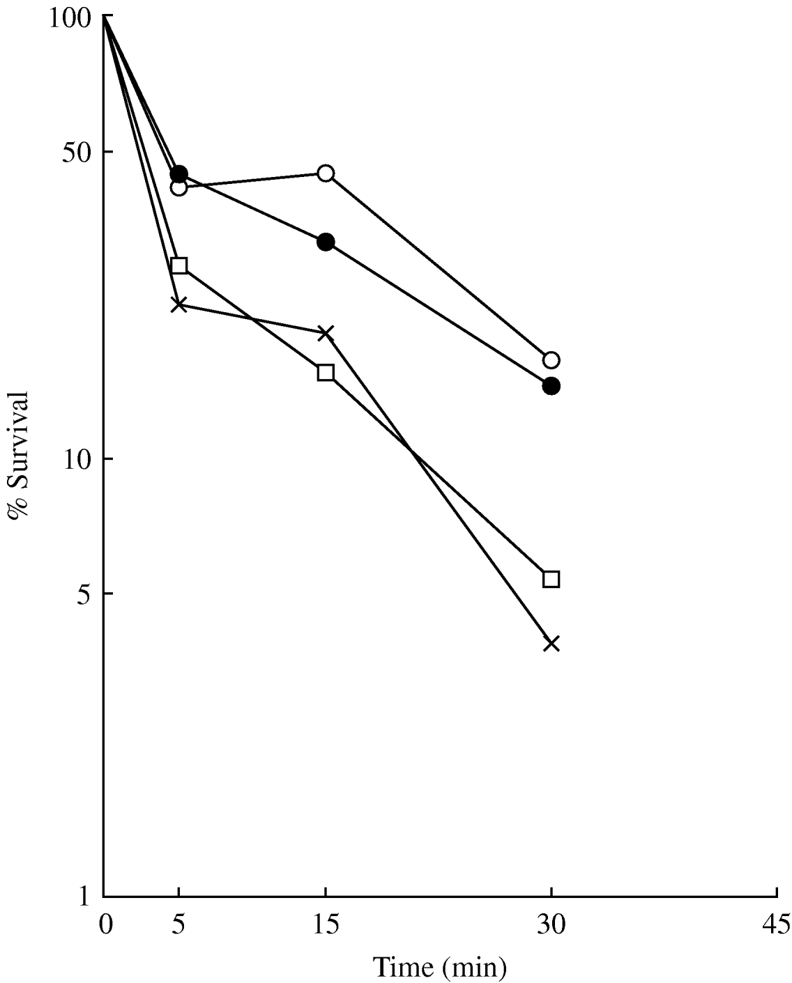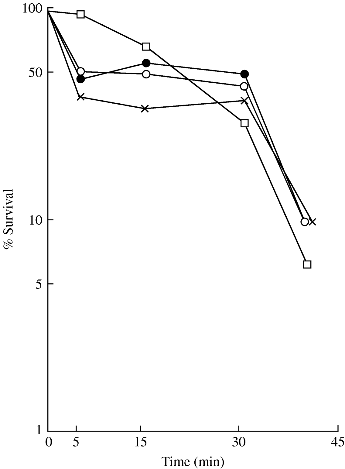 Fig. 5. Survival of F. tularensis in aerosols in open air. Effect of particle size: •, >6 μm; ○, 3–6 μm; ×, <3 μm diameter. □, E. coli (<3 μm particles) exposed to open air on microthreads.