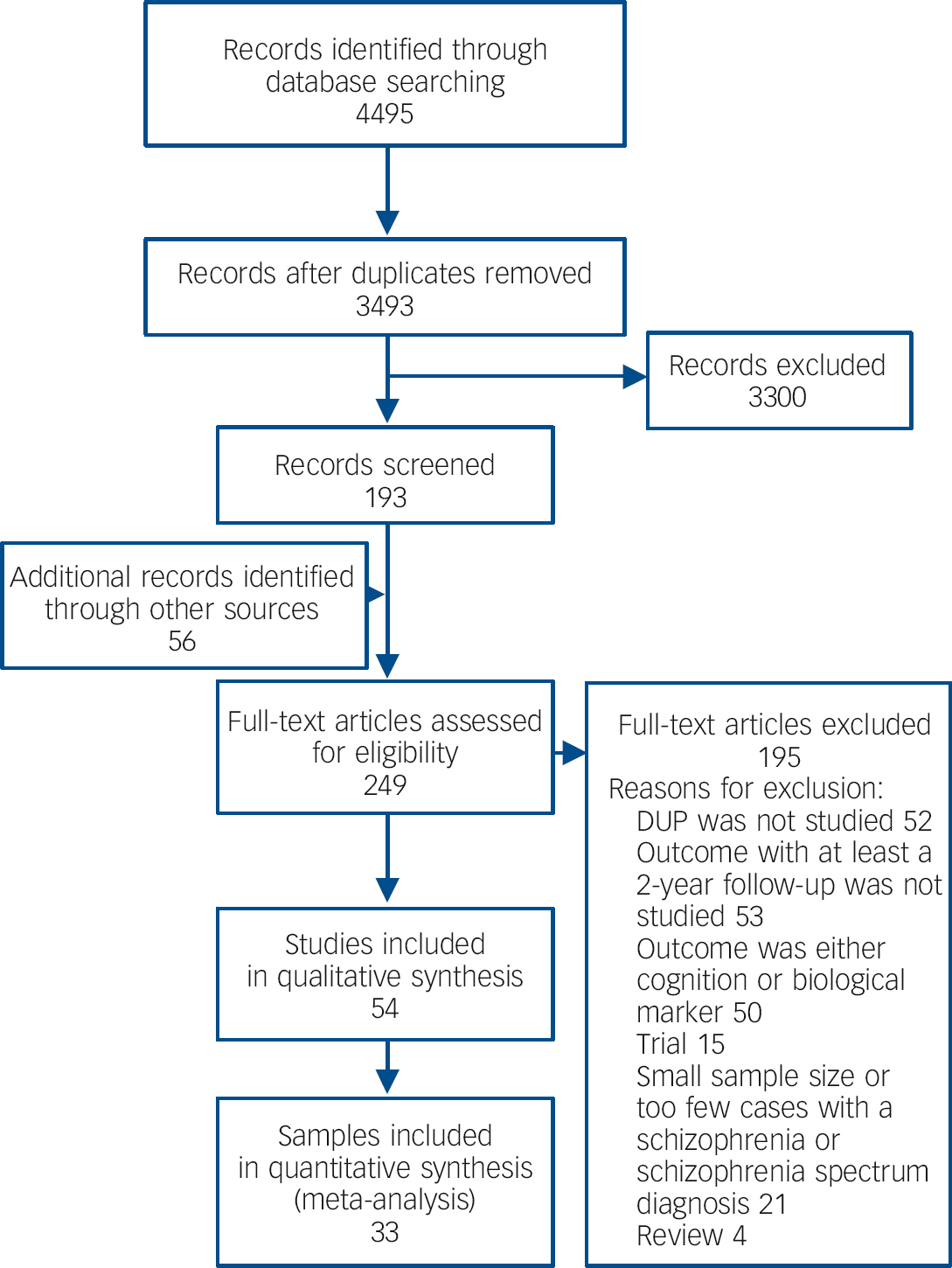 The search produced 4495 results and, after the removal of duplicates, 3493 publications were identified. Based on the information on abstracts, 193 articles were selected for comprehensive evaluation and 56 articles were found from other sources, leading to a total of 249 articles that were evaluated. Thirty-nine articles analysing 33 different samples met our inclusion criteria and were included in the meta-analysis (Fig. 1). Main reasons for exclusion were that the study did not analyse DUP (52 studies) or its association with long-term outcome (53 studies), or the outcome studied did not meet the inclusion criteria (e.g. cognition: 50 studies).