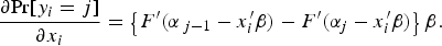 $$\eqalign{{\rm Pr}[y_i & = j\left] { = {\rm Pr}} \right[\alpha _{\,j - 1} \lt y_i^{\ast} \lt \alpha _j ] \cr & = {\rm Pr}[\alpha _{\,j - 1} \lt x_i^{\prime} \beta + u_i \le \alpha _j ] \cr & = {\rm Pr}[\alpha _{\,j - 1} - x_i^{\prime} \beta \lt u_i \le \alpha _j - x_i^{\prime} \beta ] \cr & = F\lpar {\alpha _j - x_i^{\prime} \beta} \rpar - F\lpar {\alpha _{\,j - 1} - x_i^{\prime} \beta} \rpar}$$