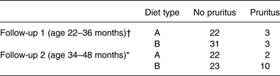 Table 1. Incidence of pruritus/atopic dermatitis signs in dogs fed for their first 12 months on diet A (test diet) or diet B (control diet ) assessed by follow-up questionnaires 1 and 2