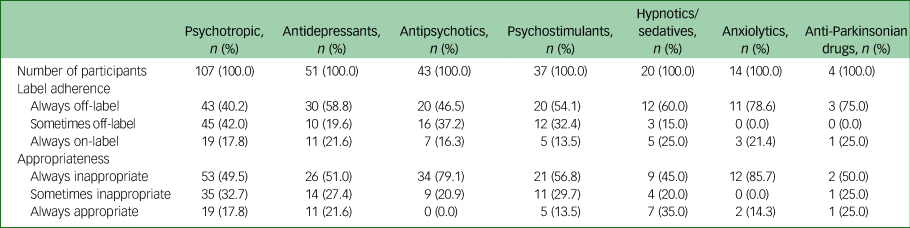 During the study period, 461 psychotropic prescriptions were provided to the 107 adolescents. Overlap was common between on-label and appropriate scenarios, and between off-label and inappropriate scenarios (Supplementary Tables 1–4 available at https://doi.org/10.1192/bjo.2020.125). The most common on-label and appropriate use scenario was using psychostimulants (methylphenidate and dexamphetamine, 27 and 11 prescriptions, respectively) for ADHD (Supplementary Tables 1 and 3). Other common on-label and appropriate scenarios were use of escitalopram for anxiety (10 prescriptions) and use of fluoxetine for depression (6 prescriptions).