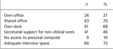 Most NCCG doctors shared an office (63, 70%), with only 24 (27%) having their own office (Table 1). Only 61 (68%) had their own desk, although a significant proportion of these would be part-time. Only 41 (46%) had administrative support for non-clinical work; 15 (16%) had their own personal computer and 67 (74%) shared one. There were 9 respondents (10%) with no access to a computer. Only 66 (73%) claimed to have access to interview space.