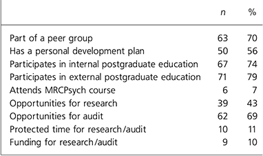 Only 63 (70%) belonged to a formal peer group and 50 (56%) described a professional development plan (Table 2); 37 (41%) had regular appraisals. Data on study leave were not conclusive as only 57 respondents (63%) knew what their entitlement was. Eighty-two (91%) did get study leave, being entitled to a mean of 30 days in 3 years; 71 (79%) were supported in this with available funding. Three-quarters of respondents claimed that they were encouraged to participate in internal and external professional development meetings, 20 (22%) had the MRCPsych, 6 (7%) attended MRCPsych courses and 45 (50%) claimed that they were not eligible to sit the examination. Although 39 (43%) and 62 (69%) said that they were involved in research and audit respectively, only 10 (11%) claimed to have protected time for this and 9 (10%) had funding available for such work.