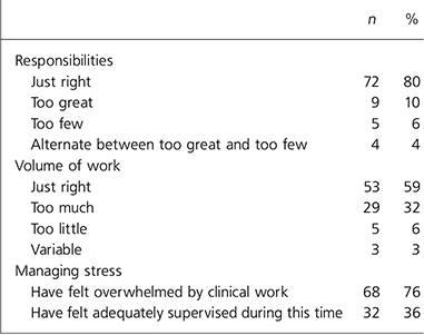 We investigated whether individuals believed that they were given responsibilities appropriate for their grade. Seventy-two respondents (80%) were comfortable with the degree of responsibility and of the 18 (20%) who were not, 9 (10%) found themselves taking on too much responsibility, 5 (6%) too little, and 14 (4%) saying their work load alternated between being too much and too little (Table 3). Feedback about the volume of work showed that 53 respondents (59%) found this to be just right, with 29 (32%) claiming too much work and 5 (6%) too little. Sixty-eight respondents (76%) often felt overwhelmed by their workload and only 32 (36%) reported adequate supervision during this time. With regard to the availability of consultant advice on clinical matters, 14 (16%) claim only to have intermittent contact with a consultant, whereas 8 (9%) report having no access to this level of clinical support.
