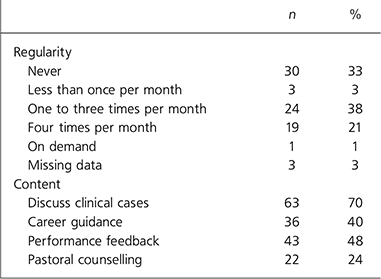 One-third of NCCG doctors had never had supervision and only half had protected time allocated for this. Of those who did receive supervision, the regularity varied from between 1 and 4 sessions every month, with 3 (3%) receiving supervision less than monthly or on demand (Table 4). The duration of supervision was extremely variable, but was often less than 30 min. When asked about the content of supervision sessions, 63 (70%) said they discussed clinical cases, 36 (40%) sought career guidance, 22 (24%) sought ’ pastoral counselling’ and 43 (48%) discussed their job performance. A separate question relating to whether independent career guidance was available revealed that 15 (17%) were able to obtain this but 32 (36%) felt they needed it and were unable to access it.