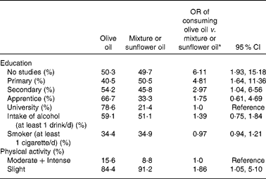 The present study also shows that persons with a greater intake of MUFA from olive oil had a higher educational level, were more physically active and consumed more vegetables than those who consumed sunflower oil, which resulted in a lower daily energy intake. This is a particularly important point if we consider that the prevalence of obesity and a sedentary lifestyle is very high in this population(Reference Soriguer, Rojo Martinez and Esteva37), although similar to that reported in other countries(Reference Bargallo, Cavera and Sapienza25, Reference Martínez, Varo and Santos38).