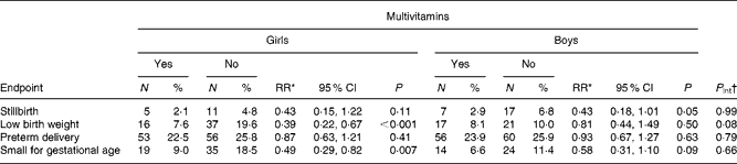 Table 2 Effect of maternal multivitamins supplementation on birth outcomes according to sex