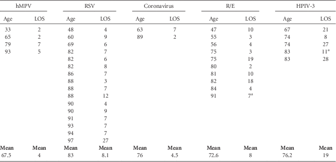 NOTE. hMPV: human metapneumovirus; HPIV-3: human parainfluenza virus type 3; ILI, influenza-like illness; LOS: length of stay in days; PCR, polymerase chain reaction; R/E: rhinovirus/enterovirus; RSV: respiratory syncytial virus.