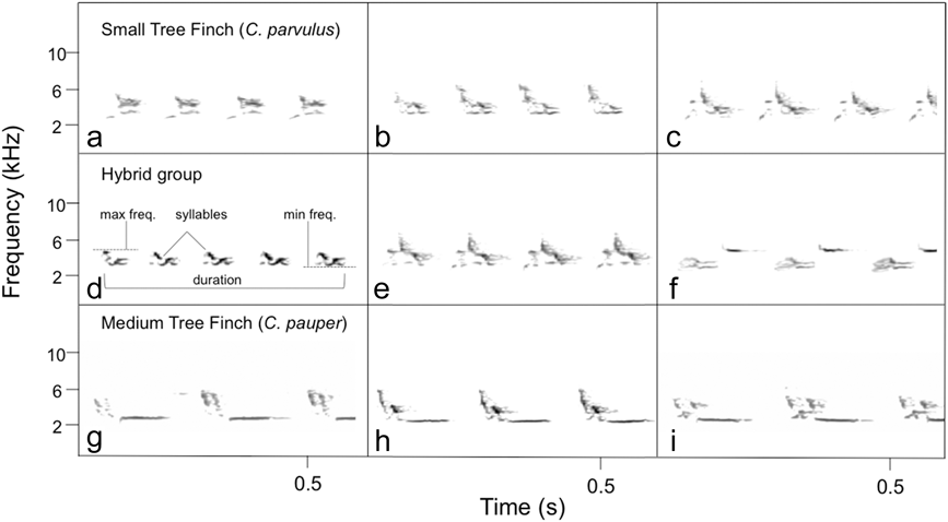 Figure 2. Spectrograms of song in: (a-c) Small Tree Finch Camarhynchus parvulus, (d-f) hybrid group, and (g-i) Medium Tree Finch C. pauper. Each spectrogram represents ∼0.6 seconds of song of one male; we chose this partial representation to include three males per genetic group and visualise the difference in trill rate between C. pauper vs. C. parvulus and hybrid. The song of C. parvulus and hybrid birds could not be statistically distinguished, while the song of C. pauper had slower trill rate, fewer syllables and lower minimum frequency (see Table 1). One spectrogram of a complete song per genetic group is provided in the supplementary material.