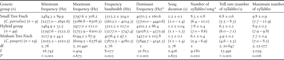 Table 1. Male song characteristics in three tree finch Camarhynchus spp. genetic groups. Data are shown as mean ± SE (95% CI), statistical results are shown for Kruskal-Wallis test* and ANOVA. The sample size per genetic group is shown in brackets. Songs were recorded from colour-banded birds in the field and retrospectively assigned to species/group after laboratory analysis of genetic samples.