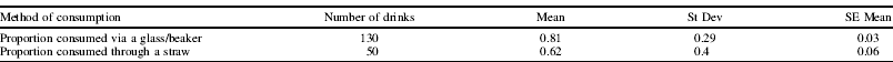 24 nursing home residents took part in this study; aged 86.3+/−8.9 (range 66–97 years), Mini-Mental State Examination score (MMSE) 11.3+/−9.7 (range 0–30). Eight residents were randomly allocated to consume their ONS drinks through a straw inserted directly into the container and sixteen residents were to have their ONS drinks given in a glass/beaker. There was no significant difference between these randomly allocated groups based on their age, MMSE or Mini-Nutritional Assessment (MNA – short form).