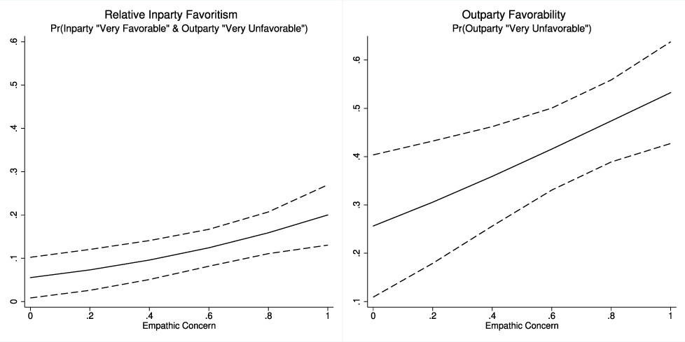 These findings may be less worrisome if they are driven primarily by positive feelings toward copartisans rather than negative feelings toward partisan opponents. However, the outparty favorability model presented in Column 2 of Table 1 provides clear evidence that empathic concern promotes rather than dampens outgroup hostility. This result is illustrated in the right-hand panel of Figure 1. Here, a min–max shift in empathic concern increases the probability of expressing the least outparty favorability by about 0.27. Together, these results suggest that empathic concern promotes affective polarization, and does so by driving negative outgroup affect.