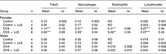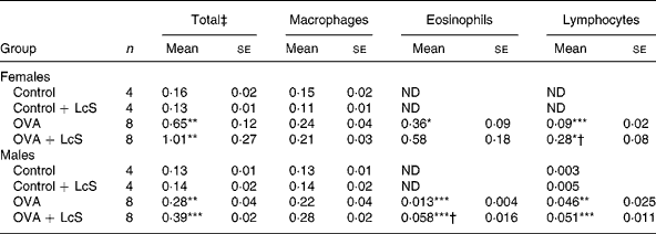 Table 2 Number of cells in lung lavage fluid in mice that received Lactobacillus casei Shirota (LcS) at adult age‡