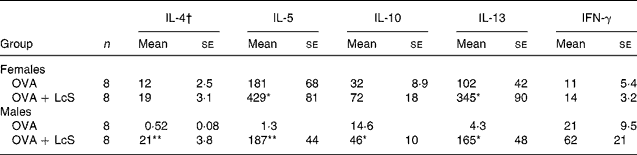 To assess if cytokine profiles were affected by LcS administration, spleen cells were cultured with ovalbumin to detect specific cytokine production. In mice that received LcS from lactation onward, no differences in specific cytokine production could be detected (data not shown). In adult mice that received LcS, however, cytokine production was enhanced (Table 3). In females, all Th2 cytokines were increased in the LcS group. For IL-5 and IL-13 this was significant, for IL-4 (P = 0·089) and IL10 (P = 0·063) this was not. IFN-γ levels were comparable in both groups. In males, all Th2 cytokines were significantly higher in the LcS group. IFN-γ was also higher in this group but this was not significant (P = 0·09).