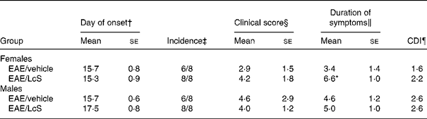 After immunization with MBP, the first clinical symptom that was observed was loss of tonicity in the tail. In males, there was no difference on the day of onset of EAE for vehicle-treated rats (between days 14 and 18) and LcS-treated rats (between days 15 and 21) after immunization. In Table 4 several clinical parameters are summarized. In vehicle-treated rats, six out of eight animals developed clinical symptoms, whereas all LcS-treated rats developed EAE. Other parameters, such as clinical score per rat, duration of symptoms and cumulative disease index, were not affected by LcS. In females, day of onset was similar in vehicle-treated rats (between days 12 and 18) and LcS-treated rats (between days 11 and 18). Table 4 shows that all females that received LcS developed clinical symptoms, while six of the eight rats that received vehicle developed EAE. Furthermore, after LcS administration, clinical score per animal and cumulative disease index were higher. The effect on clinical score was not significant however. In addition, LcS significantly increased the duration of symptoms, the disease symptoms lasted almost 3 d longer (P = 0·026).