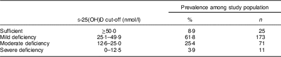 A common universal normal range for s-25(OH)D does not exist; however, we chose to use the commonly used cut-off points, where vitamin D status is classified as severely deficient (0–12·5 nmol/l), moderately deficient (12·6–25·0 nmol/l), mildly deficient (25·1–49·9 nmol/l) and sufficient (≥50·0 nmol/l)( Reference Lips 16 ).