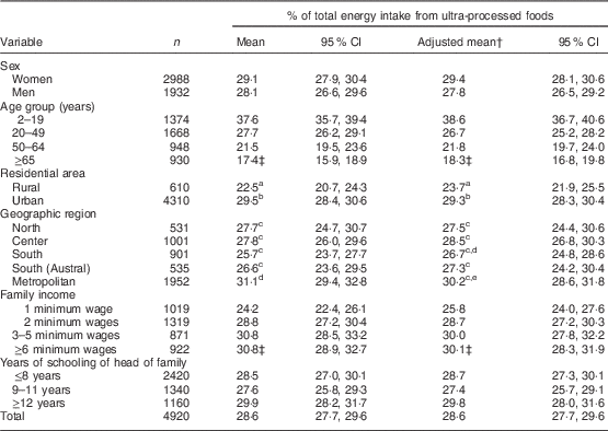 Table 2 Dietary share of ultra-processed foods according to sociodemographic variables in the diet of the Chilean population aged 2 years or above (2010)Footnote *