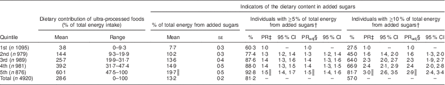 Similar associations between the dietary contribution of ultra-processed foods and the dietary content of added sugars were seen in all age groups, being more pronounced among children and adolescents (see online supplementary material, Supplemental Tables 1 to 3). For instance, children and adolescents in the highest quintile of ultra-processed food consumption were four times more likely to exceed the 10 % added sugars cut-off than those in the lowest quintile (adjusted prevalence ratio=3·9; 95 % CI 2·7, 5·9). The same prevalence ratios were 2·7 (95 % CI 2·2, 3·3) among adults and 2·3 (95 % CI 1·8, 3·0) among the elderly.