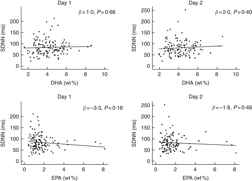 Fig. 3 Associations between DHA or EPA and overall heart rate variability (HRV) (24-h standard deviation of normal intervals (SDNN)) in patients on chronic dialysis. The first column shows results from day 1 and the second column shows results from day 2. The lines represent the regression lines of the simple linear regression analyses. There was no significant associations between DHA, EPA and SDNN. wt%, weight percent.