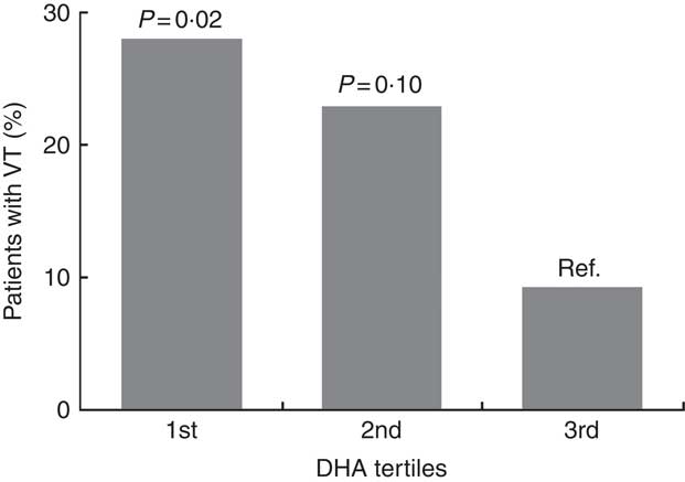 Fig. 4 Patients with episodes of non-sustained ventricular tachycardia (VT) according to level of DHA in plasma phospholipids. P values are for comparisons with the highest tertile as a reference. Comparisons across all three groups (χ 2 test) was also significant (P=0·04). The ranges of tertiles are 1st tertile: 1·60–3·45 wt%, 2nd tertile: 3·46–4·64 wt% and 3rd tertile: 4·65–8·59 wt%. wt%, weight percent.