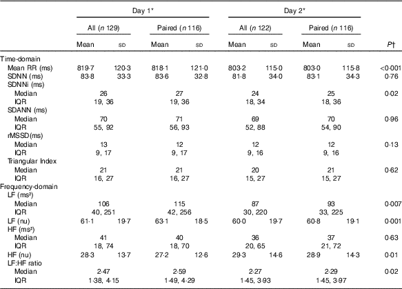 † Comparisons between days were made on paired data using either paired t test or signed-rank test.