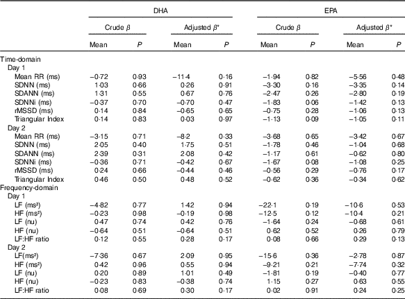 Table 3 Regression coefficients from simple and multivariate linear regression analyses of associations between heart rate variability (HRV) and DHA or EPA content in plasma phospholipids (Regression coefficients (β) and P values)