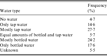 The type of drinking water used by subjects is shown in Table 2. For analysis, we combined the categories of ‘only bottled water’ or ‘mostly bottled water’ into a single category of ‘primarily bottled water’, while the remainder (except those with missing data) were combined and considered as ‘primarily tap water’. We included those reported as drinking no water in the tap-water group, since exposures to tap water would be expected to occur from use of water in cooking, brushing teeth, etc. Race and ethnicity were tied to bottled-water use, with those of black race, Hispanic ethnicity, and other races all having higher (and similar) rates of reported bottled-water use compared to non-Hispanic whites. We therefore included race/ethnicity as a potential confounder in the regression model, using an indicator variable for ‘non-Hispanic white’ vs. ‘all other race/ethnicity’. Use of some type of filter was reported by 17·7% of subjects.