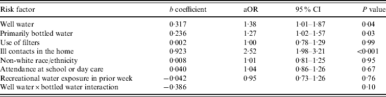 As shown in Table 3, of the other factors studied, only presence of ill contacts at home with diarrhoea was independently associated with increased odds of illness. Attendance at school or day care was not associated with diarrhoeal illness. When the analysis was restricted to infants aged <3 years, the association with day care remained non-significant (aOR 1·13, 95% CI 0·89–1·44), and the adjusted odds ratio for ill contacts was unchanged. We considered the possibility that the association between bottled water and illness could be due to cross-contamination by ill contacts in the home. We therefore performed an analysis stratified by the presence of ill contacts; there was no change in the results.