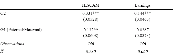 We look at three different dimensions of socioeconomic status: social class, occupational status, and earnings. The summary statistics for individuals by social class (HISCLASS), occupation (HISCAM), and earnings are given in Table 1. Social class is measured at about the same age for all generations (the observation closest to age 40) according to HISCLASS, which is a 12-category occupational classification scheme based on skill level, degree of supervision, whether manual or non-manual, and whether urban or rural.Footnote 9 We group the 12 classes into five which are described in Table 1. About 12 percent of grandfathers belonged to the top group of higher occupations, while this proportion increased to 30 percent for grandsons. At the same time, the proportion of farmers went down from 36 percent to 14 percent reflecting the changes taking place in social structure over the twentieth century in Sweden (Dribe, Helgertz, and van de Putte Reference Dribe, Helgertz and van de Putte2015).