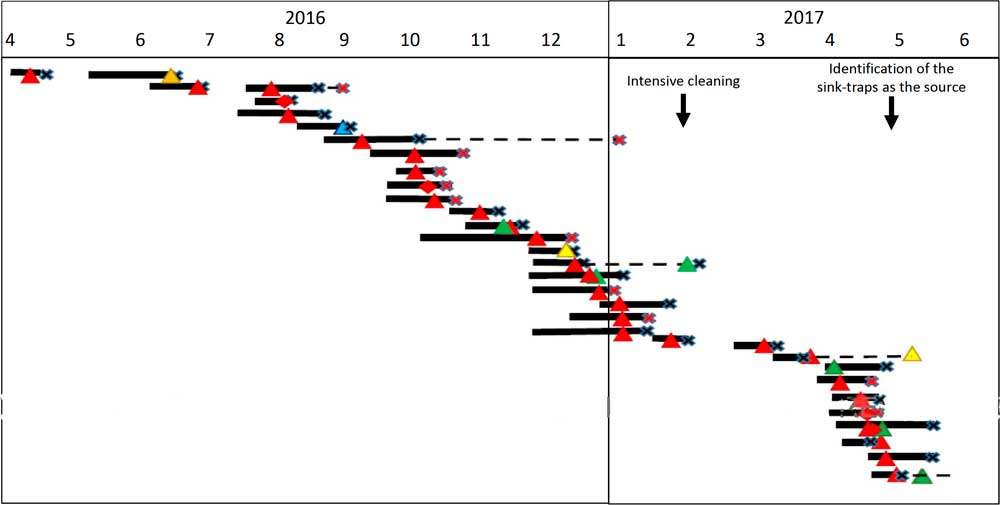 Following the identification of the sinks, and particularly the sink traps, as the source of transmission, we carried out 2 main measures: (1) sink-trap decontamination efforts and (2) an educational intervention enhancing specific infection control measures and focusing on the sink as a source of transmission. Within a few weeks, bed occupancy returned to full, with 15–16 patients consistently hospitalized in the ICU.