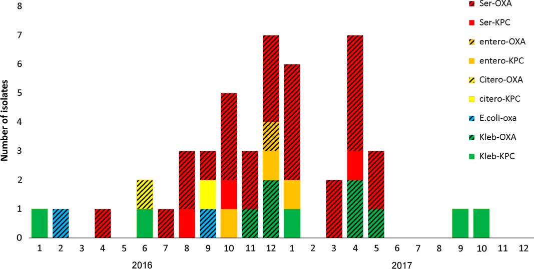 Carbapenemase-producing Enterobacteriaceae can produce a broad spectrum of infections; they associated with high mortality and very limited therapeutic options. Particularly troubling are Serratia and Proteus, which are innately resistant to colistin, one of the last-resort therapeutic options. Patient-to-patient cross transmission is the main mechanism of spread of multidrug-resistant (MDR) Enterobacteriaceae nosocomial outbreaks. Colonized patients are considered the most important reservoir, and infection control breaks in hand hygiene via healthcare workers is considered the predominant transmission chain.Reference Friedman, Carmeli, Walton and Schwaber 7 Environmental reservoirs have not been frequently reported as the source for such outbreaks.