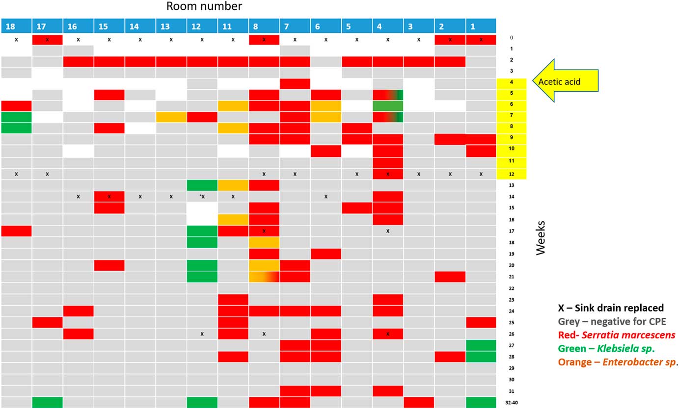 The persistence of CPE, and particularly the epidemic strain, for many months after the last infected patient was discharged highlights the importance of this underappreciated environmental reservoir and suggests that the plumbing system is persistently contaminated, even after intensive decontamination efforts including PCIP treatment, weekly treatment with acetic acid, and repeated sink-trap replacement. Indeed, Weingarten et alReference Weingarten, Johnson and Conlan 31 showed that wastewater pipes are a vast resilient reservoir of CPOs; they found common plasmid backbones in both environmental areas and in the patient population. The various infection control strategies to contain outbreaks related to hospital water environment were recently summarized,Reference Kizny Gordon, Mathers and Cheong 12 but none of the strategies reviewed (including bleach, hydrogen peroxide, UV light, or sink and drainage system replacement) was particularly successful, similar to our experience. Especially concerning was the failure of the new and expensive Moveoshiphon technology in our experience. Our result is somewhat unlike that of Mathers et al,Reference Mathers, Vegesana and German Mesner 27 who reported a successful bundled intervention including hopper covers and use of the Moveosiphon. However, they concluded that their ability to assess the efficacy of these self-disinfecting sink traps was limited and requires further evaluation.