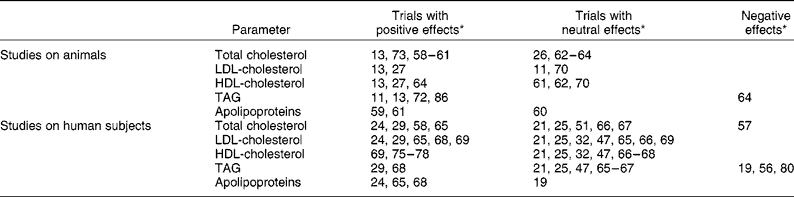 Several studies have focused on the possible positive effects of grape products on different lipid profile parameters, particularly total cholesterol, and likewise on LDL- and HDL-cholesterol, TAG and apolipoproteins. The results of these trials are summarised in Table 4.