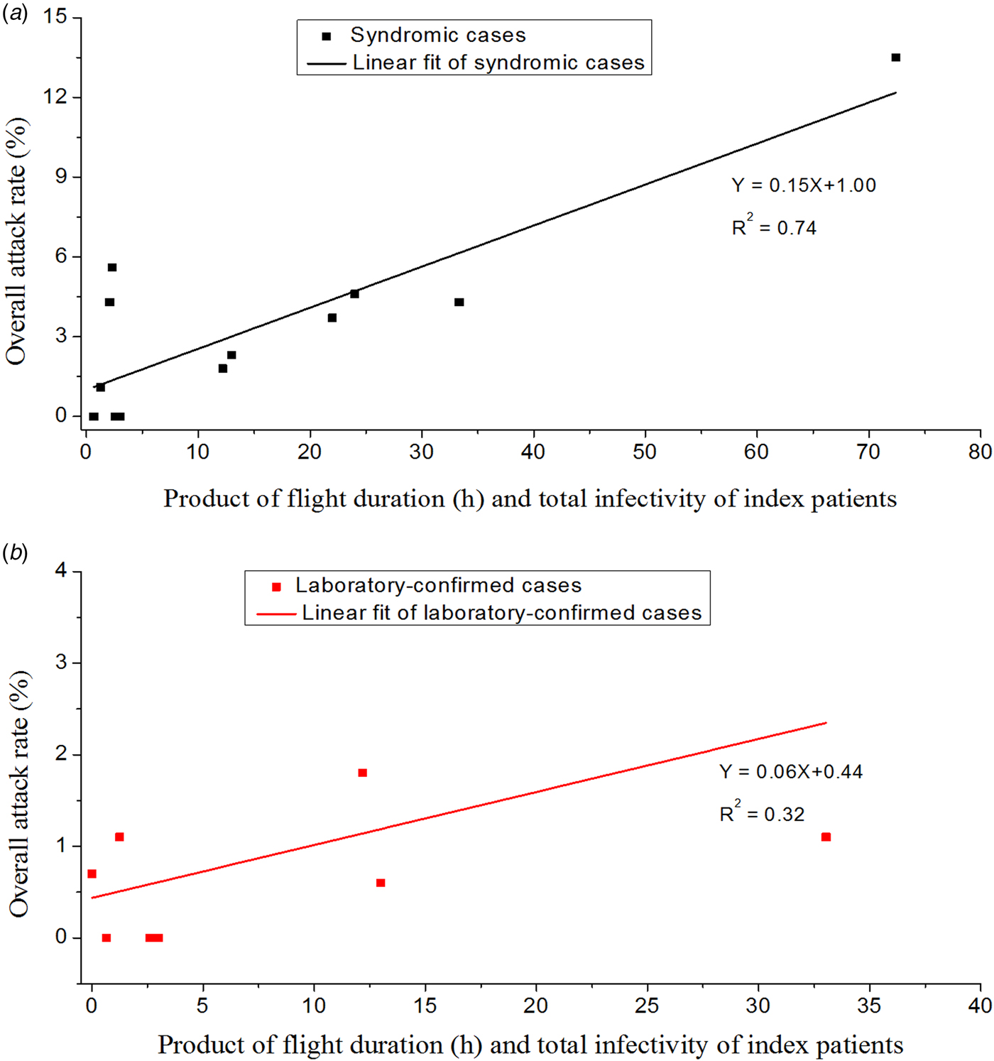 Second, we explored whether the attack rate had a linear relationship with the product of the flight duration and the total infectivity of the index cases, because according to the Wells–Riley equation for airborne routes, the infection risk increases linearly with an increase in the product of the ‘quantum’ generation rate (infectivity) and the exposure time when the infection risk is low (see online Supplementary material).