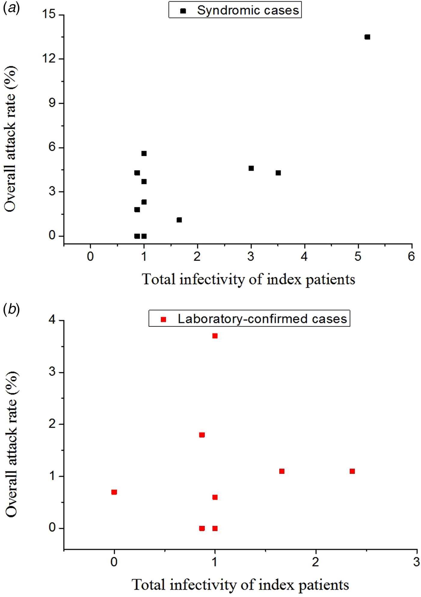 Fig. 4. Attack rates with the total infectivity of all index cases when restricted to (a) syndromic secondary cases and (b) laboratory-confirmed secondary cases.