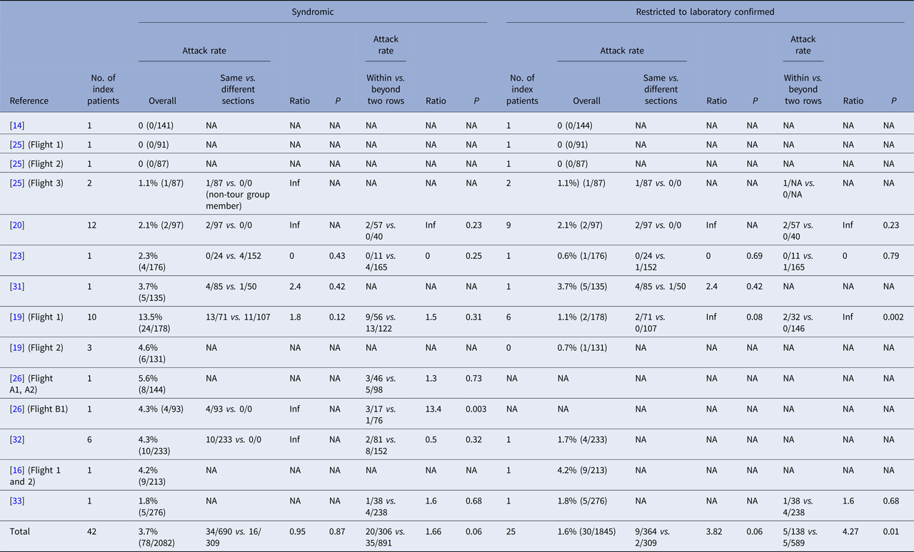 As a possible transmission route of influenza, the large-droplet (⩾10 µm diameter) route is confined to within 2 m of the index cases. Given that the typical distance between each seat in the economy class of an aeroplane is around 0.8 m [Reference Kim23], the close contact of an index case is defined as passengers seated within two rows of and on the seats on either side of the index cases, partly coinciding with the WHO guideline regarding the contact tracing of passengers seated within two rows of an infectious case of influenza A (H1N1)pdm09 [24]. The attack rate is defined as the number of secondary cases divided by the number of interviewed susceptible passengers. As this study focused on the possibility of transmission during air travel, the members of the tour group [Reference Han25] (Flight 3), members of the student group [Reference Català15, Reference Baker20] and travel companions [Reference Neatherlin26] (Flight B1) known to have interacted with the index case(s) outside of the travel were excluded from the analysis.