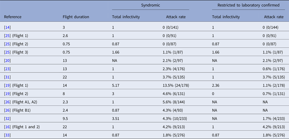 Table 2. Flight duration, total infectivity of all index cases and attack rates by flights