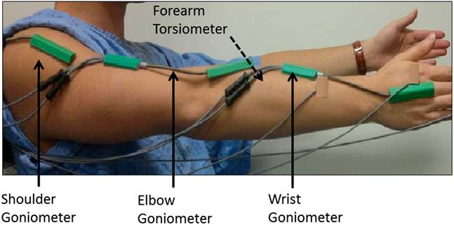 Figure 2 Setup and placement of the multisensor kinematic technology. Denoted by the black solid arrows, a goniometer was placed over each joint. Denoted by the black dotted arrow, a torsiometer was placed along the inside of the forearm.
