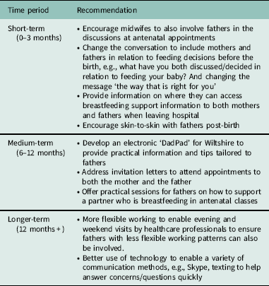 Overall, this study showed that the support a father can give the mother when they are struggling with breastfeeding is immense. However, fathers are often unaware of the problems that can arise and then feel frustrated and unable to help. They also are not sure of their role in feeding decisions and the feeding process. These points echo a previous study with men whose partner had given birth within the past two years; researchers found fathers wanted to support their partner in breastfeeding but felt left out of any discussions with health professionals or antenatal education on the matter (Brown et al., Reference Brown, Dodds, Legge, Bryanton and Semenic2014). Similarly in a study including in-depth interviews of fathers in the UK, researchers found fathers wanted to be more involved in breastfeeding but felt there was a lack of information around the benefits and practicalities of breastfeeding targeted at them (Sherriff and Hall, Reference Sherriff and Hall2011).