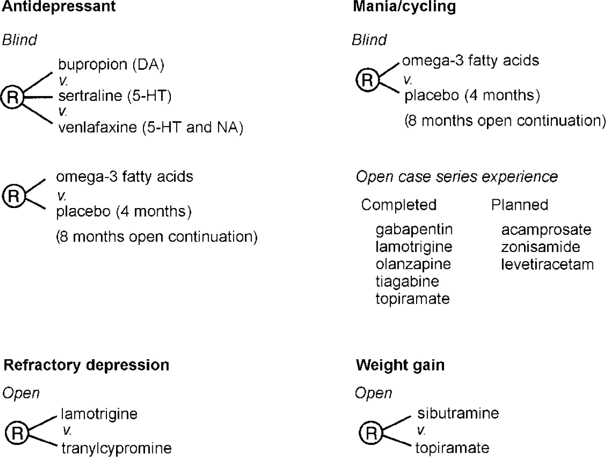 Figure 4 summarises some of the ongoing randomised open or blind clinical trials and naturalistic case series within the SFBN. After the comparative antidepressant trials, the major study in the SFBN is the omega-3 fatty acids trial. Following on the findings of Stoll et al (Reference Stoll, Severus and Freeman1999), we are comparing 6 g of the nearly pure eicosapentaenoic acid (EPA) form of omega-3 fatty acid with placebo in a 4-month double-blind trial to augment existing treatment with mood stabilisers. Ninetyone patients have already been randomised. In contrast with most other SFBN studies, which compare the efficacy of several drugs at a given clinical choice point (at which evidence is unavailable regarding which option is best), this protocol is the first in the Network to use a placebo. Yet it should not be onerous to patients (Reference Post, Denicoff and LeverichPost et al, 2000a ) since it involves a randomised add-on to existing treatment, following which all patients will have the option of an 8-month open treatment trial.
