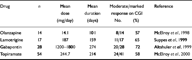 | Drug | n | Mean dose (mg/day) | Mean duration (days) | Moderate/marked response on CGI | Reference | |