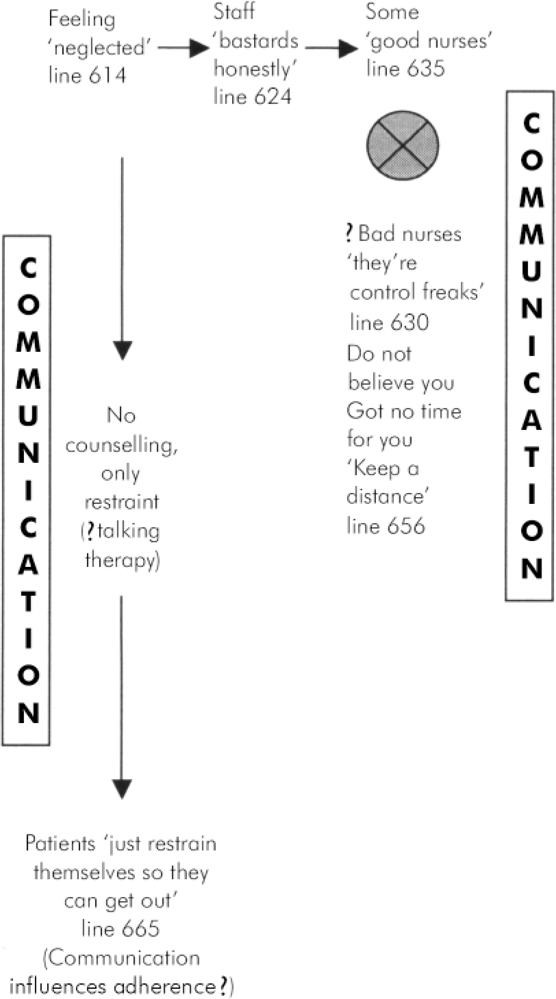 Ethical approval was obtained from the Research Ethics Committee, University Hospital, Nottingham, and ten participants were recruited. All the participants had a diagnosis of schizophrenia, and had been discharged from an acute adult in-patient ward in Nottingham within the past year. A ‘ theoretical sampling’ strategy ensured that the sample comprised participants admitted voluntarily and detained under the Mental Health Act 1983. Of the ten participants, six were male and seven were detained under the Mental Health Act 1983 during their most recent admission. The ages of the participants ranged from 20 to 54 years, and the number of previous admissions ranged from 0 to 20. Nine of the participants identified their ethnicity as White British and one as African-Caribbean.