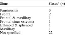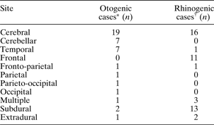 Similar to previous reported findings,Reference Jones, Walker, Bassi, Jones and Punt9 most of our rhinogenic abscesses had acute sinusitis but no history of sinus disease – only 18 per cent had pre-existing sinus disease. However, the converse is true for otogenic cerebral abscesses. This is the likely reason for the current predominance of rhinogenic abscesses compared with those of otogenic origin – prevention of acute sinusitis is nigh on impossible, whereas prevention and eradication of chronic ear disease has improved over the years.