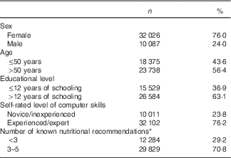 Of the 123 984 participants included in the NutriNet-Santé study between May 2009 and October 2013, 43 028 individuals (34·7 %) returned this optional questionnaire on computer skills and Internet use. Among them, 42 113 subjects (97·9 %) had available data on all studied covariates, and were thus included in the present study. Characteristics of the study population are presented in Table 1. In all, 76·0 % of the participants were women, 56·4 % were aged 50 years and older, 36·9 % had completed 12 years of schooling or less, 23·8 % considered themselves as novice/inexperienced in computer use and 29·2 % knew fewer than three official nutritional recommendations. The proportions of subjects according to sex, age and educational level categories are presented in the online Supplementary Table S1 and compared between the French adult population (National census 2014( 39 )), the overall NutriNet-Santé cohort and the present study population.