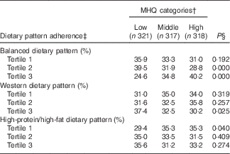 The participants’ adherence to the three DP that were identified in the HWCS population( Reference Denova-Gutiérrez, Castañón and Talavera 39 ) was examined for each of the MHQ categories over the 7 years of follow-up, and is presented in Table 2. A higher percentage of participants with greater adherence to the balanced dietary pattern were classified in the higher MHQ category than in the lower MHQ category (40·2 v. 24·6 % respectively, P≤0·000), whereas a greater percentage of participants adhering to the Western dietary pattern were categorised in the lower MHQ than in the higher MHQ category (37·4 v 30·2 %, respectively, P≤0·025). A greater percentage of participants with lower adherence to the high-protein/high-fat dietary pattern were classified in the higher MHQ than in the lower MHQ category (35·3 v 29·4 %, respectively, P≤0·040).