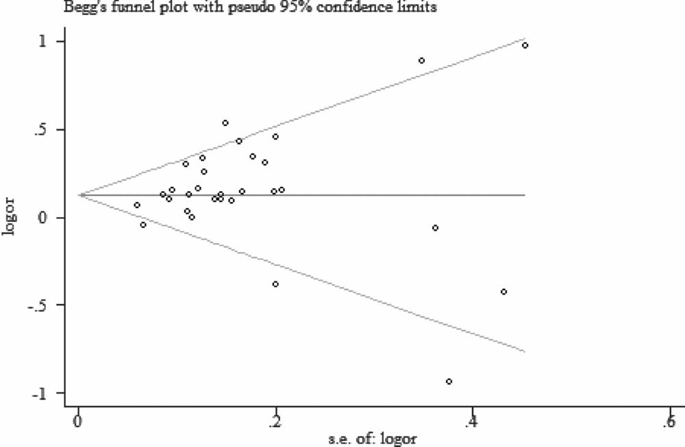 Although we made considerable efforts to collect all available data in our comprehensive analysis, some limitations should be acknowledged. First, although we included 23,370 subjects in our research, the sample size was relatively small in the stratified analyses, particularly for pathologic types. More research needs to be done to establish the relationship. Second, although the source of the controls did not differ, the inclusion criteria did not have a uniform definition. Healthy controls who were recruited from the same geographical area acted as the reference group for some studies, whereas others studies selected hospital patients without organic lung cancer as the reference group. Furthermore, age, gender, smoking status, cancer type, and ethnicity were not consistent in all studied subjects. As stated above, these factors may be sources of heterogeneity. Finally, although Begg's funnel plot and the Egger's test did not indicate any publication bias in our research, the tests excluded unpublished articles and abstracts, which might lead to a publication bias. In spite of this, our research is far more comprehensive than any single study to date.