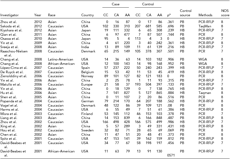 In order to evaluate the effects of covariance, we performed subgroup analyses, determined by ethnic subgroup (Asian and Caucasian), control source (population-based and hospital-based), and pathologic types (SCC and AC). All analyses were carried out using Stata software, version 11.1 (Stata Corporation, USA). All of the p values were two-sided, wherein less than .05 was considered statistically significant.